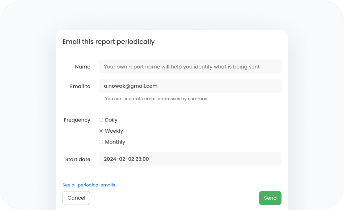Once you get the report, you can export it as a PDF/CSV, Excel file, or Google Spreadsheet or prepare a handy, shareable link. You can also schedule periodical emails with reports.